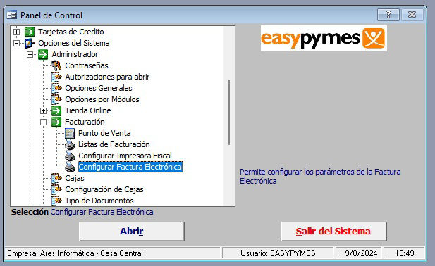 Seleccione "Configurar Factura Electrónica" y haga lick en "ABRIR", o con el mouse haga doble click en "Configurar Factura Electrónica".